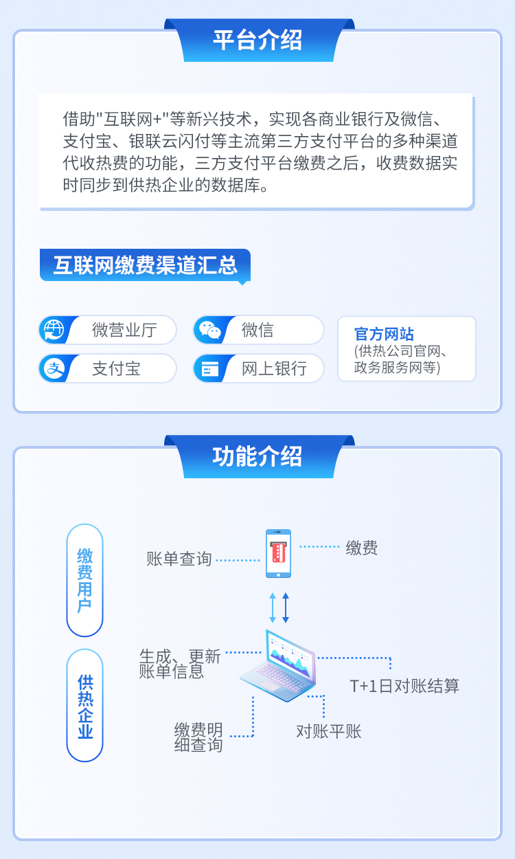 借助"互联网+"等新兴技术,缴费系统实现了各商业银行及微信、支付宝、银联云闪付等主流第三方支付平台的多种渠道代收热费的功能,方便热用户在收费高峰期根据自身实际情况,选择较为方便的便捷缴费渠道,完成缴费业务,极大增强用户服务体验。
